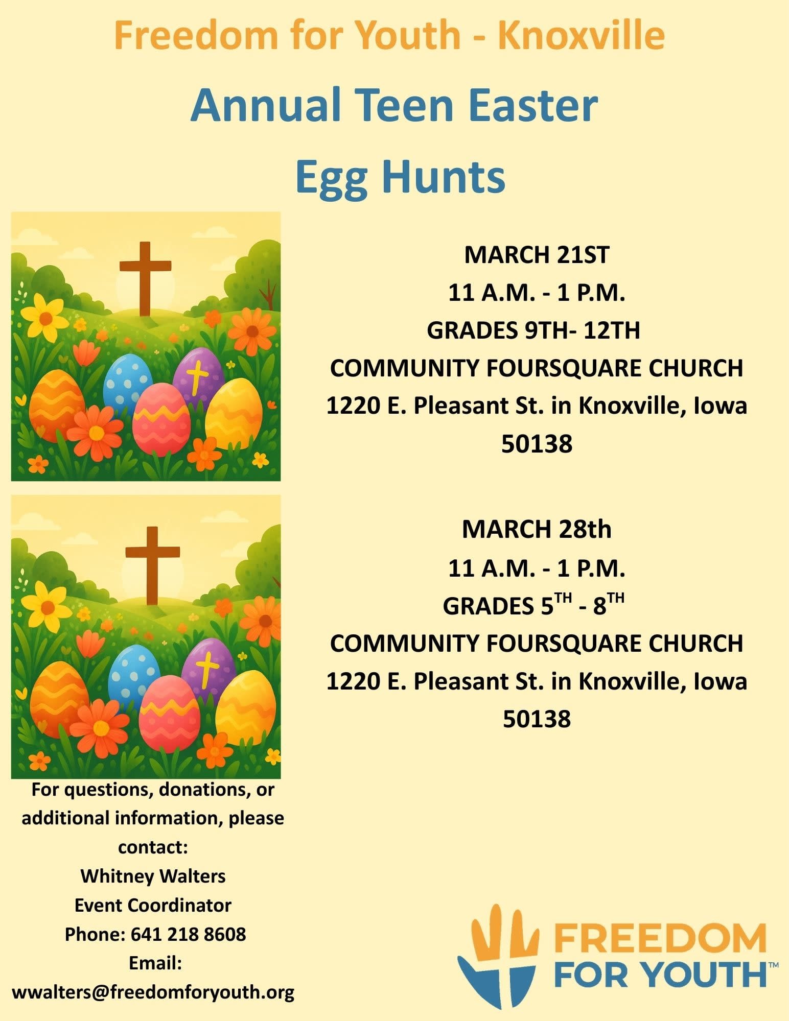 Join us at the Community Foursquare Church for our annual teen Easter egg hunt for middle school ( Grades 5th through 8th ).