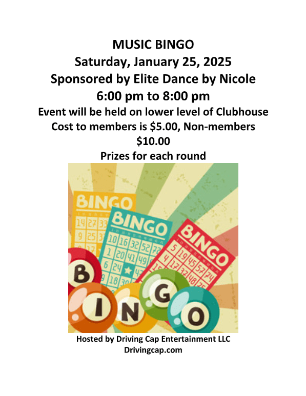 Music Bingo from 6 to 8. Prizes provided by our sponsor, Elite Dance by Nicole. Clubhouse opens at 4. Bingo starts at 6 pm